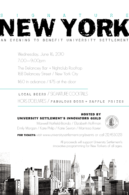 The DetailsKick off the summer in style with Signature New York, an evening of classic New York drinks and bites held amidst the palm fronds and fountains of The Delancey's rooftop bar on the Lower East Side on Wednesday, June 16, 2010. Hosted by University Settlement Innovator's Guild members, Maxwell Hatfield-Biondo, Elizabeth Hoffman, Emily Morgan, Kate Philip, Katie Sexton and Marrissa Xavier, the event will feature local beers, signature cocktails and the chance to win fabulous prizes, including gift certificates to some of New York City's finest restaurants, Yankees tickets and more!