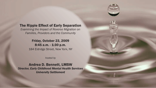 About the PresentersAndrea Bennett, LMSW -- Andrea Bennett is the Director of Early Childhood Mental Health Services at University Settlement. During her tenure at the Settlement, she started the Butterflies program, a mental health program for children under five and their families. Andrea has over 10 years of experience in direct service, program development, and early childhood mental health. Andrea's previous employers include the Research Foundation for Mental Hygiene, Project Liberty Unit, and the NYC Administration for Children's Services. In addition to her MSW from NYU School of Social Work, she has completed a Post-Master's Certificate in Social Work Administration from Hunter College School of Social Work and the Middle Management Program at Columbia Business School.~